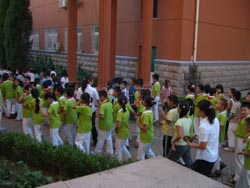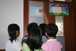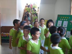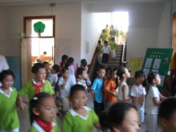 在汶川大地震之后学校领导就把教会学生安全疏散,学会危机时刻自我保护放在了安全教育的首位。校长在校会中向全校师生介绍了安全疏散图的作用,同时提出疏散时注意的事项。知道了图示的作用后,孩子们围着疏散图,兴奋地找寻着自己班级的位置,同时还七嘴八舌研究起了新学期上下楼的路线。