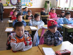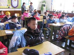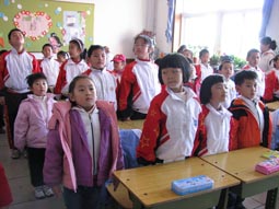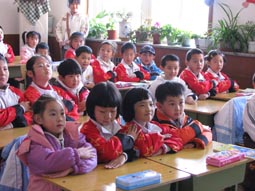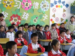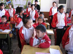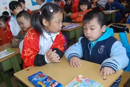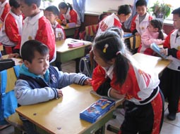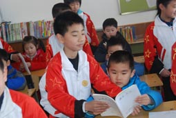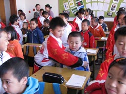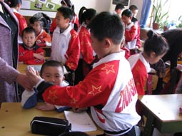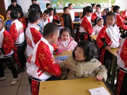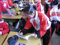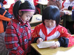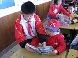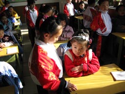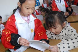 “身坐直、向前看”“小妹妹,头再高挺一些!”“书本这样放才整齐!”……指导起比自己才小一两岁的孩子们,小“老师”们一个个煞有其事。那认真的样子,还真像个老师呢!