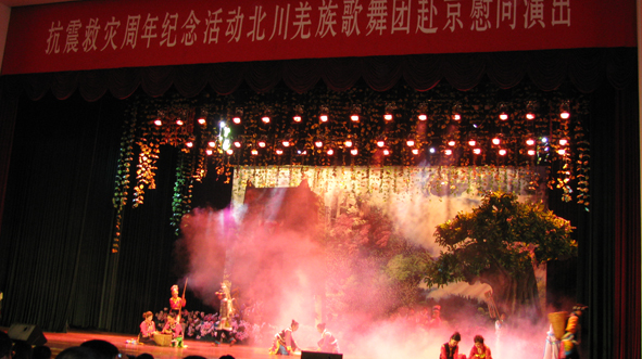 值此四川汶川大地震周年纪念之际,由中华慈善总会、中国民间文艺家协会、北川羌族自治区人民政府联合主办的“北川羌族歌舞团赴京慰问演出”于5月12日晚上在政协礼堂演出。我校七十余名学生在老师的带领下观看了他们的精彩表演。