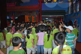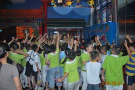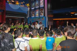 下午五点到达影城,工作人员还专门为大家组织了有奖竞猜活动。有电影人物竞猜,有古诗接龙,还有转盘摇奖……孩子们出色的表现令影城工作人员非常满意。最后,每个住宿生都得到一个奖品,看到孩子们那乐滋滋的样子,带队老师们也美在心里。