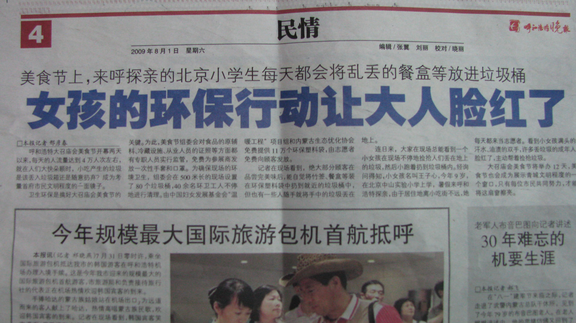 开学初,校长收到一份特殊的礼物,一张呼和浩特晚报。晚报上第四版有一行醒目的标题:《女孩的环保行动让大人脸红了》副标题是:美食节上,来呼探亲的北京小学生每天都会将乱丢的餐盒等放进垃圾桶。