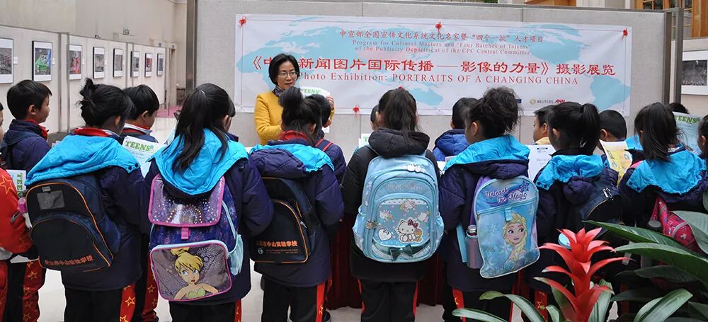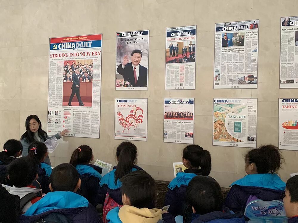 中国日报是国外友人了解中国的平台和窗口,“说明中国,点评世界; 传播中国, 影响世界”,同学们在研学手册上清晰地看到了中国日报社的宣传口号。大厅内的主题墙面展示了不同版本的中国日报。