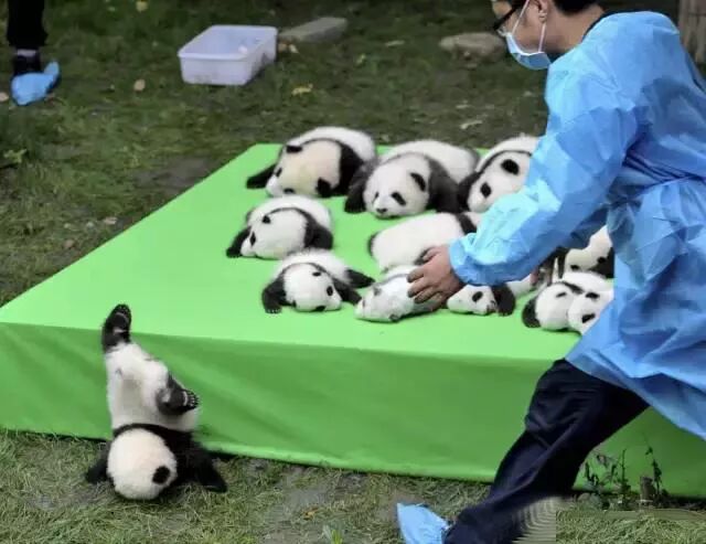 那是2016年9月29日,四川成都大熊猫繁育研究基地,一名饲养员匆忙上前帮助摔下台的大熊猫宝宝,当日,二十三只当年在国内出生的大熊猫宝宝集体亮相。