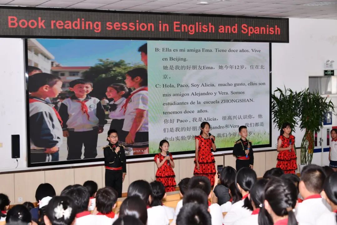 西语也是中山教学特色,分享会也是孩子们自信绽放时刻!张紫萱同学娓娓讲述“小青蛙”的智慧;五位同学围绕学校,用流利的西班牙语自信交流;三年级的部分孩子用西班牙语唱响欢快的“如果你感到快乐你就拍拍手”,节奏轻快灵动,现场互动热烈!