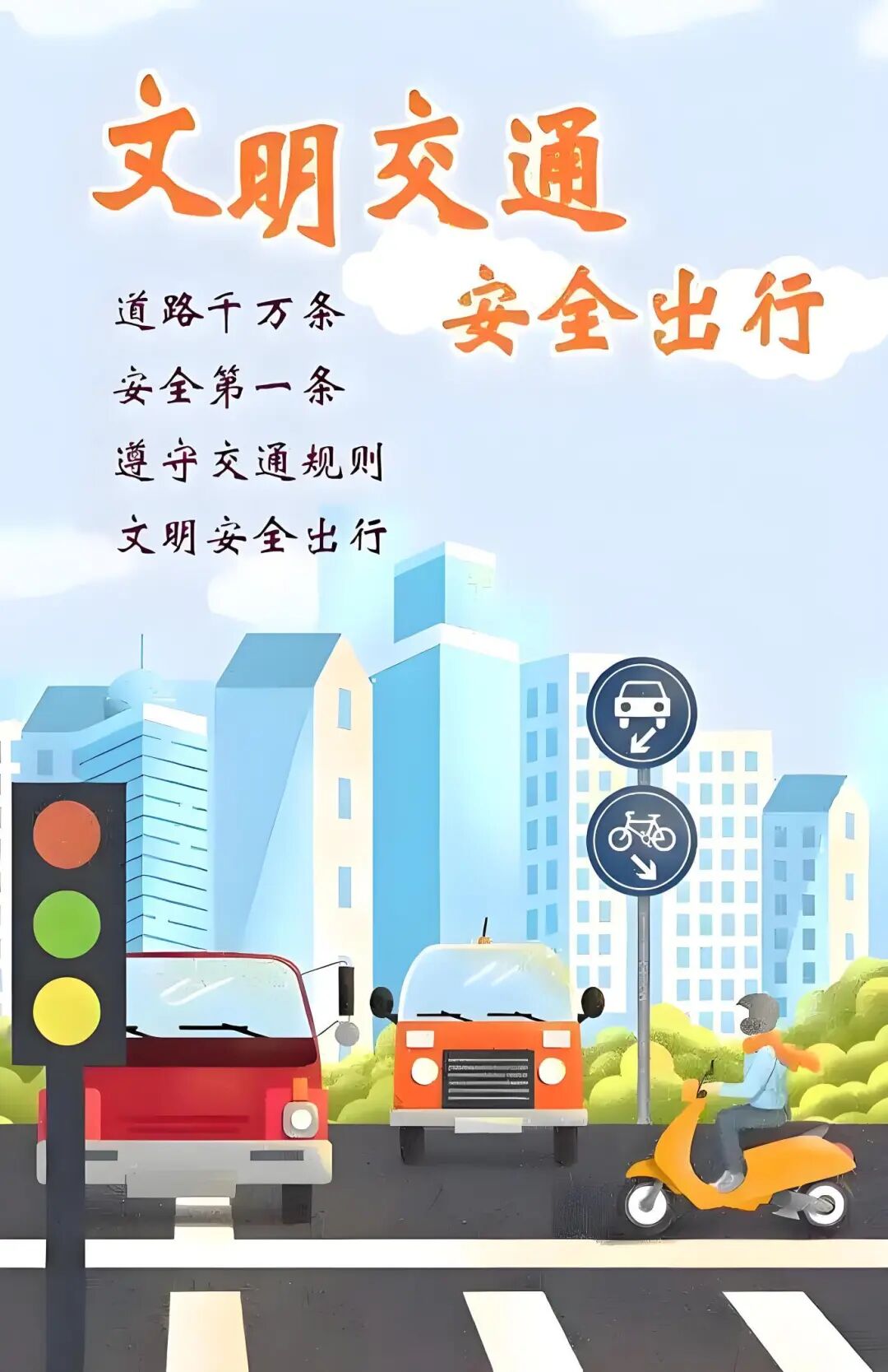 乘车安全:选择正规交通工具,不坐无牌无证、超载车辆。乘坐公交、地铁时有序上下车,不抢上抢下,系好安全带。家长骑电动车接送时,大人小孩均需佩戴安全头盔。