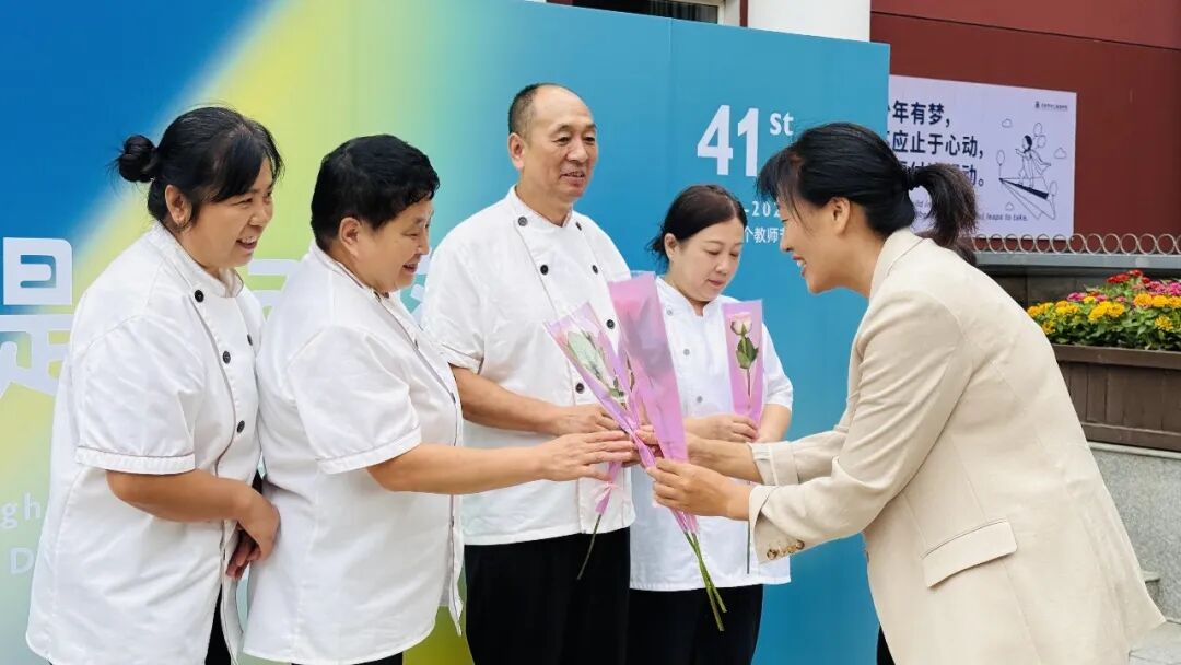 李辉校长为教职员工献上祝福和鲜花