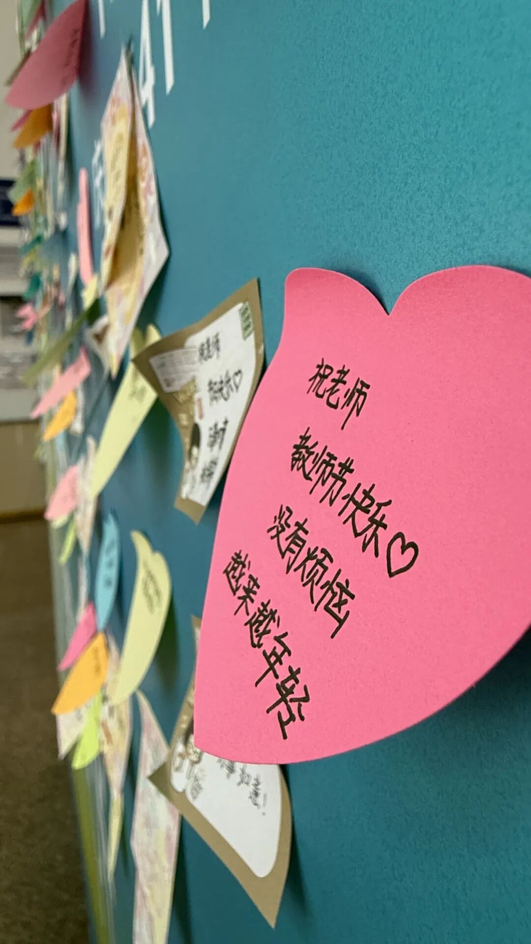 放学后再看节日祝福留言板,已经密密麻麻贴满了孩子们想对老师说的话。