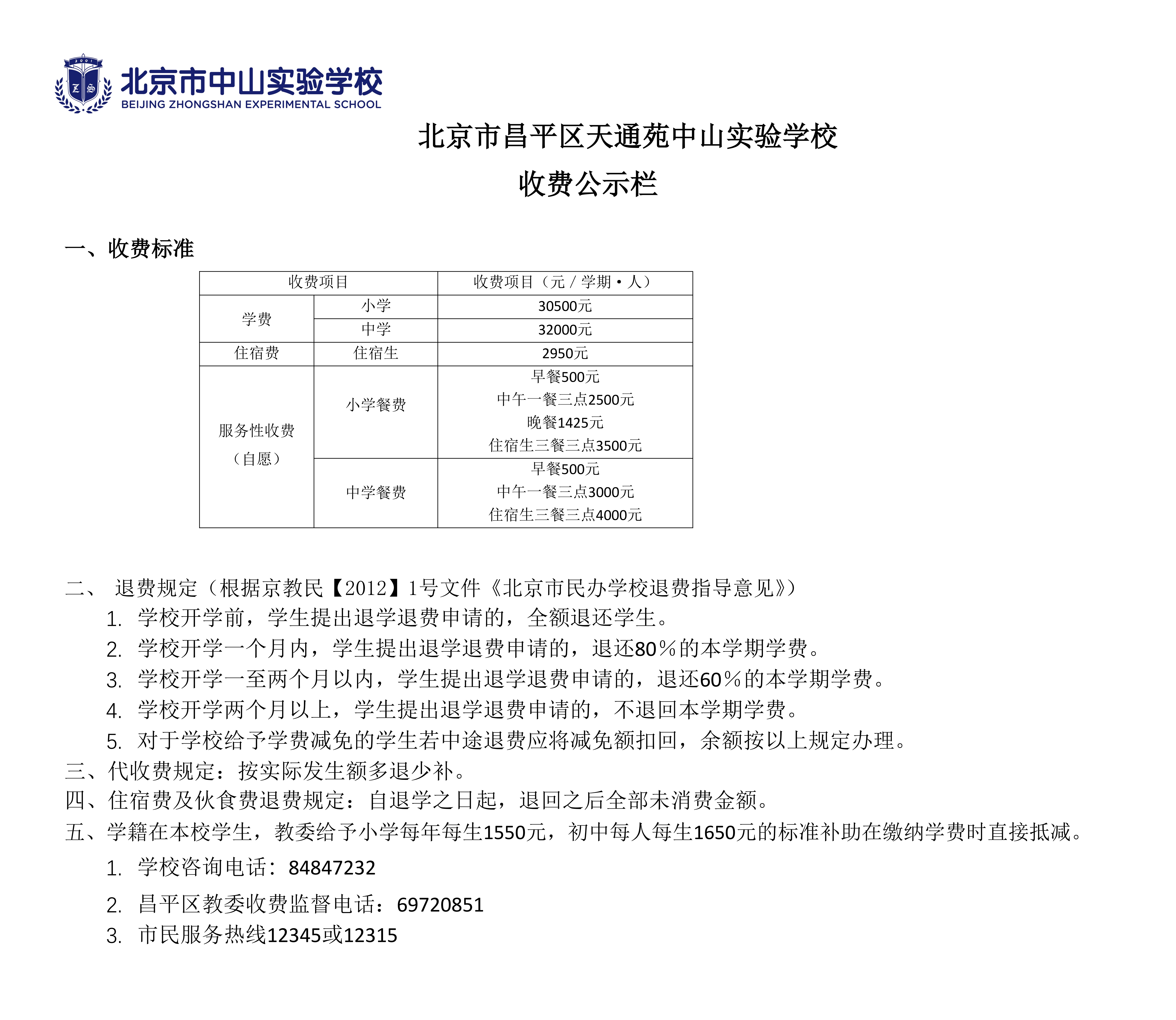 北京市昌平区天通苑中山实验学校 收费公示栏