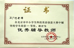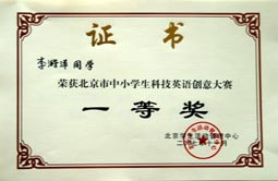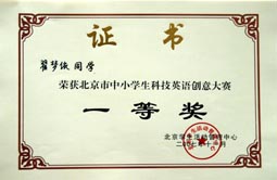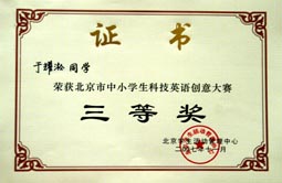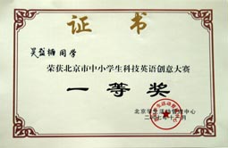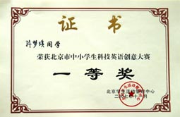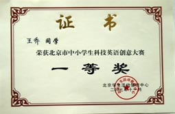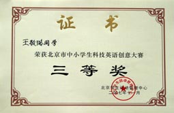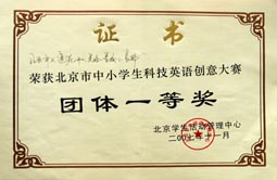 在2007年北京市中小学生科技英语创意大赛中我校再获团体一等奖。这也是我校连续三年获得该大赛团体一等奖的殊荣。另外我校的李澔洋、翟梦依、王乔、吴盛楠、孙梦琪五名同学获得个人一等奖;于耀淞、王敬璐两位同学获得个人三等奖;历广珍老师被评为“优秀辅导教师”。